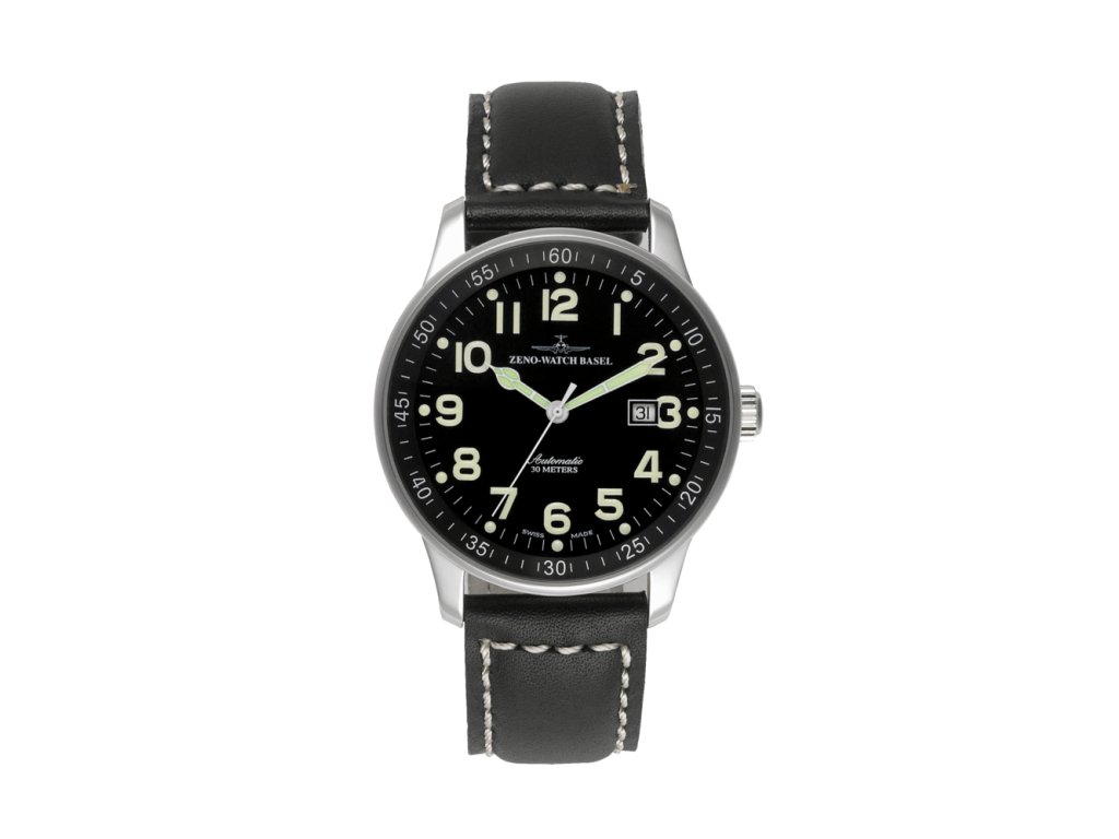 Mechanický, vysoce kvalitní švýcarský stroj ETA 2836, uložený v 25 rubínových kamenech, s maximální 47 hodinovou rezervou. Kontrastní číselník s luminiscenčními číslovkami na černém podkladu spolu s nostalgickými, snadno čitelnými ručičkami, tvoří velice přehledný ukazatel času. Švýcarský křížový znak na korunce dodává tomuto modelu charakter klasických pilotních hodinek z roku 1980. Pouzdro průměru 44mm je vyrobené z odolné nerezové vysoce leštěné oceli. Na každém detailu se odráží nadšení, které věnoval Felix W. Huber výrobě tohoto výjimečného mistrovského díla ZENO-WATCH BASEL.